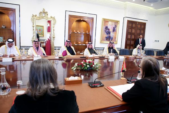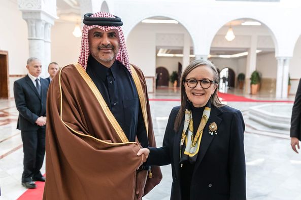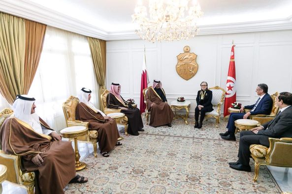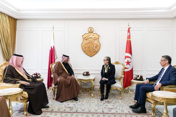 رئيسة الحكومة السيدة نجلاء بودن رمضان تستقبل بالجناح الرئاسي لمطار تونس قرطاج الدولي، الشيخ خالد بن خليفة بن عبد العزيز آل ثاني رئيس مجلس الوزراء ووزير الداخلية في دولة قطر، والوفد المرافق له.